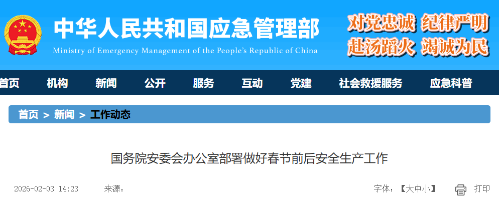 2月3日,国务院安委会办公室印发紧急通知,部署各地区、各有关部门和中央企业认真贯彻落实习近平总书记重要指示精神,切实做好春节前后安全生产工作,强化重大风险防控,坚决防范遏制群死群伤特别是重特大生产安全事故。