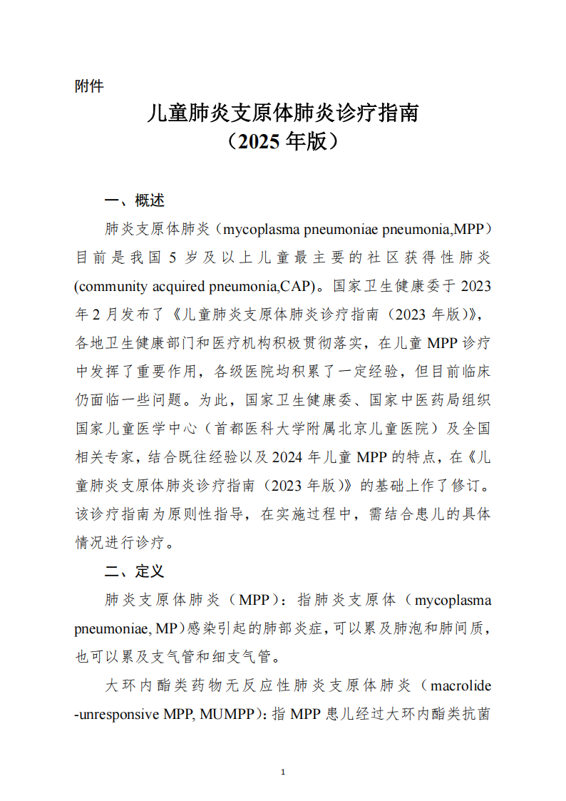 为进一步提高儿童肺炎支原体肺炎诊疗规范化水平,保障医疗质量安全,国家卫生健康委、国家中医药局组织对《儿童肺炎支原体肺炎诊疗指南(2023年版)》进行修订,形成了《儿童肺炎支原体肺炎诊疗指南(2025年版)》。现印发给你们(见附件,可在国家卫生健康委网站医政司栏目下载),请做好组织实施工作。